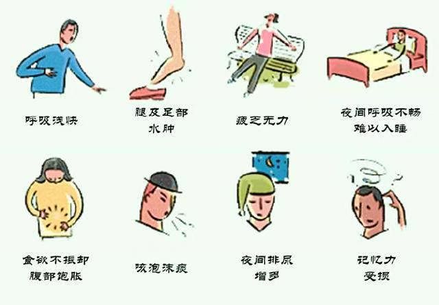 乏力疲惫、胸闷气短、下肢肿胀、夜尿多、腹胀食欲下降、端坐呼吸困难。