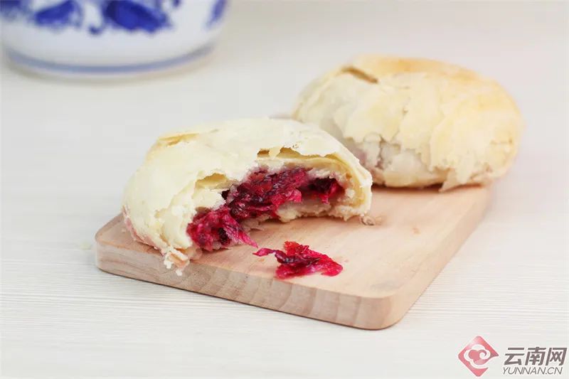 鲜花饼是一款以云南特有的食用玫瑰花入料的酥饼,是具有云南特色的经典点心代表。