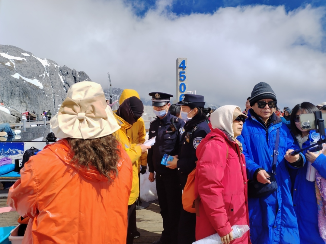 普法工作队员和玉龙山派出所景区民辅警将普法宣传与景区社会治安管理工作有机结合,深入海拔4506米的玉龙雪山冰川公园开展普法宣传。