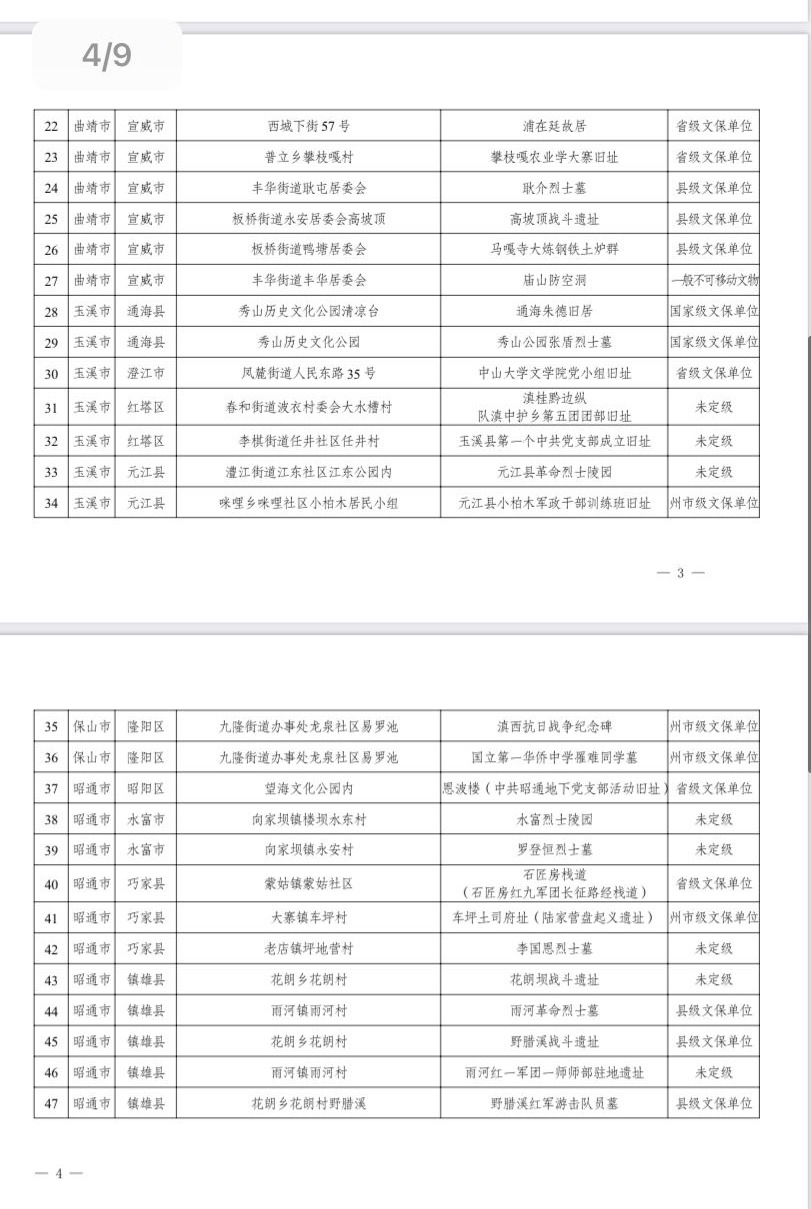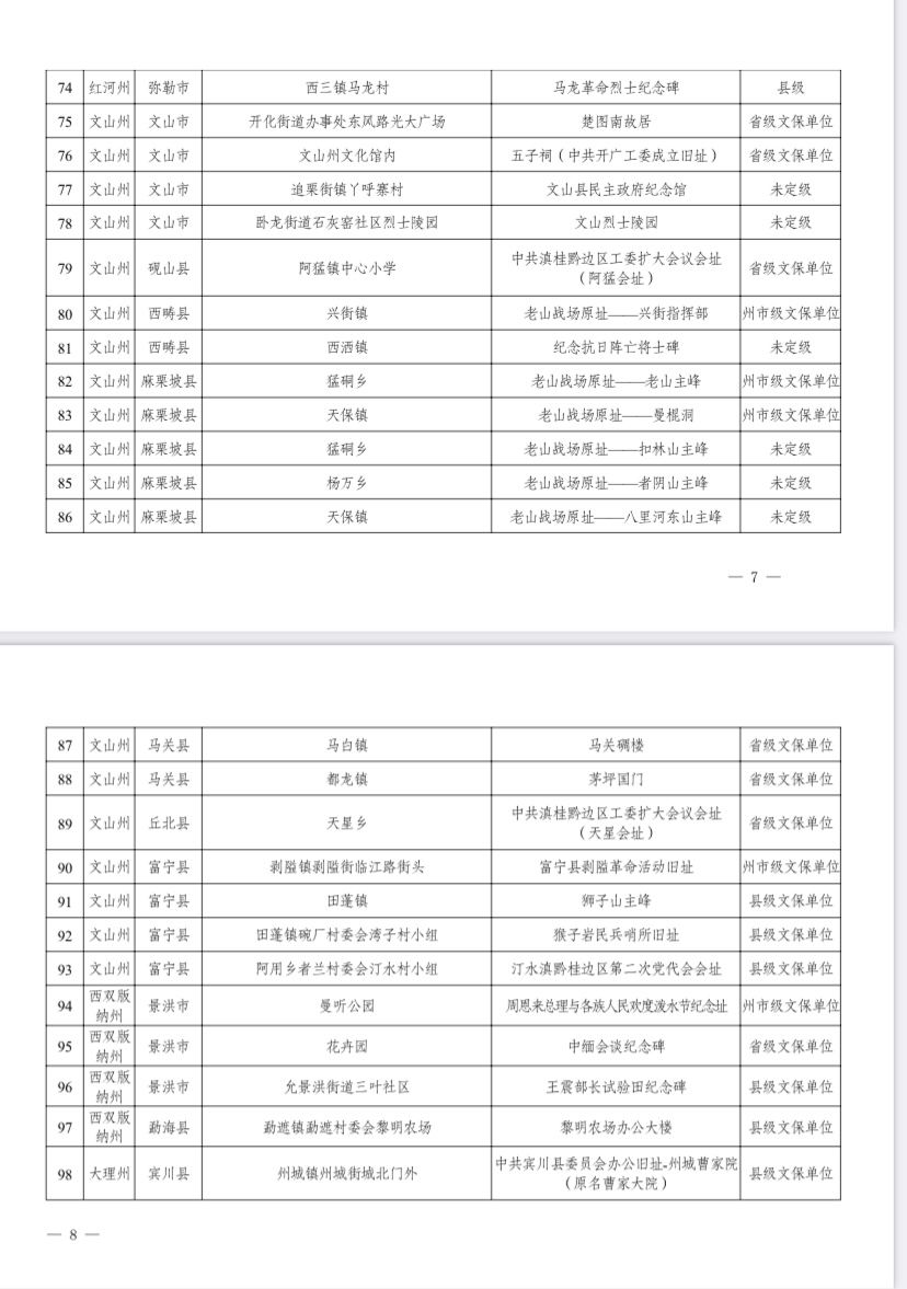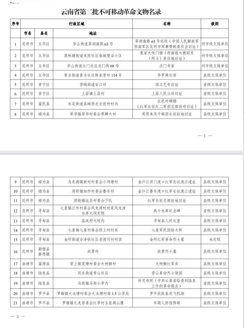 7月3日,云南省文化和旅游厅公布关于云南省第二批不可移动革命文物名录的通知,全省共有107项革命文物入选,包含全国重点文物保护单位2项,省级文物保护单位17项,州(市)文物保护单位17项,县(市、区)文物保护单位38项,一般不可移动文物33项。