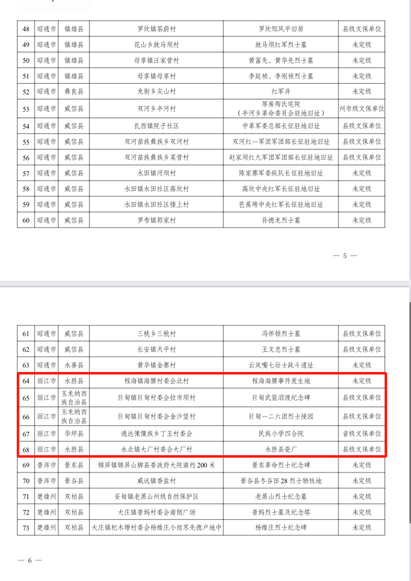 其中,丽江市永胜县程海海腰事件发生地、永胜县瓷厂、玉龙县巨甸武装泅渡纪念碑、玉龙县巨甸一二六团烈士陵园、华坪县通达傈僳族乡民族小学四合院5项入选。