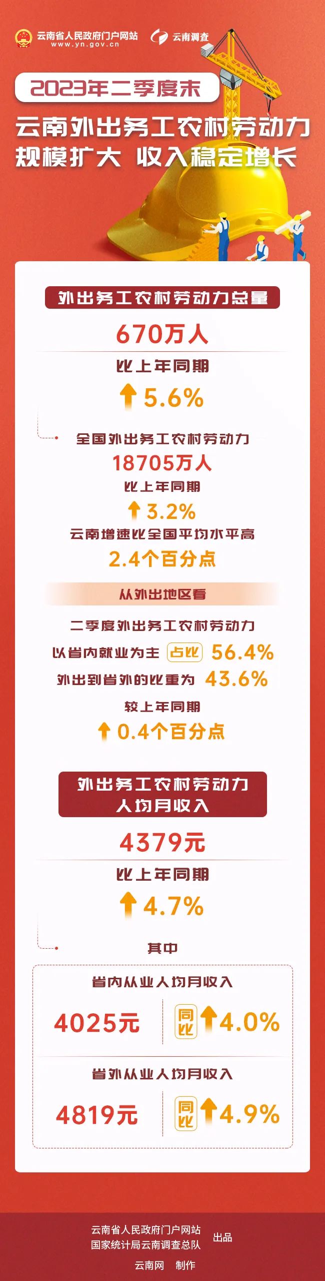 今年以来,云南省扎实做好稳就业、保民生、促发展工作。国家统计局云南调查总队在全省范围内开展的农民工监测调查结果显示,2023年二季度末,云南省外出务工农村劳动力总量为670万人,比上年同期增长5.6%;外出务工农村劳动力平均月收入4379元,比上年同期增长4.7%。云南省外出务工农村劳动力的稳定增长,为稳就业、促发展提供了有力支撑。