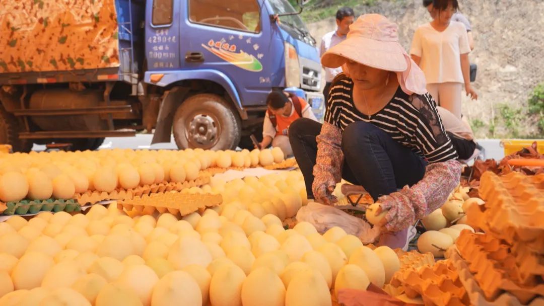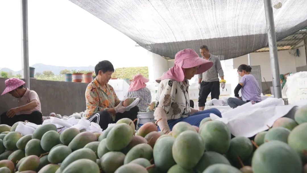 走进华坪石龙坝,蓝盈盈的金沙江奔流如带,山坡上一棵棵芒果树绿意葱茏、生机勃勃。在临江村村民王道贵家,工人正忙着采收芒果,一片繁忙的景象。