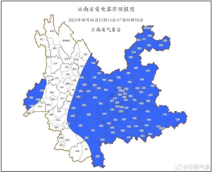 2023年8月6日08:00~8月7日08:00,昆明市主城区中部及西部、东川区、安宁市、晋宁区、寻甸县、嵩明县、富民县,玉溪市红塔区、峨山县、易门县、新平县,曲靖市马龙区、宣威市、会泽县,迪庆州香格里拉市、德钦县、维西县,丽江市古城区、玉龙县、宁蒗县、华坪县、永胜县,大理州大理市、鹤庆县、洱源县、漾濞县、云龙县、永平县、巍山县、宾川县、祥云县、南涧县,楚雄州楚雄市、禄丰市、武定县、大姚县、姚安县、南华县、双柏县,怒江州泸水市、贡山县,保山市隆阳区、腾冲市、龙陵县,德宏州芒市、盈江县、陇川县、瑞丽市,临沧市永德县、镇康县、耿马县、沧源县,普洱市景东县、镇沅县、墨江县、江城县,红河州蒙自市、个旧市、开远市、弥勒市、建水县、石屏县、绿春县、元阳县、金平县、屏边县、河口县,文山州马关县发生滑坡泥石流的风险高;昆明市大部,玉溪市大部,昭通市北部至南部,曲靖市北部至西部、东南部,楚雄州大部,迪庆州大部,丽江市大部,怒江州大部,大理州大部,保山市北部至西部、南部,德宏州大部,临沧市大部,普洱市北部至东部、西部,红河州大部,文山州大部发生滑坡泥石流的风险较高。