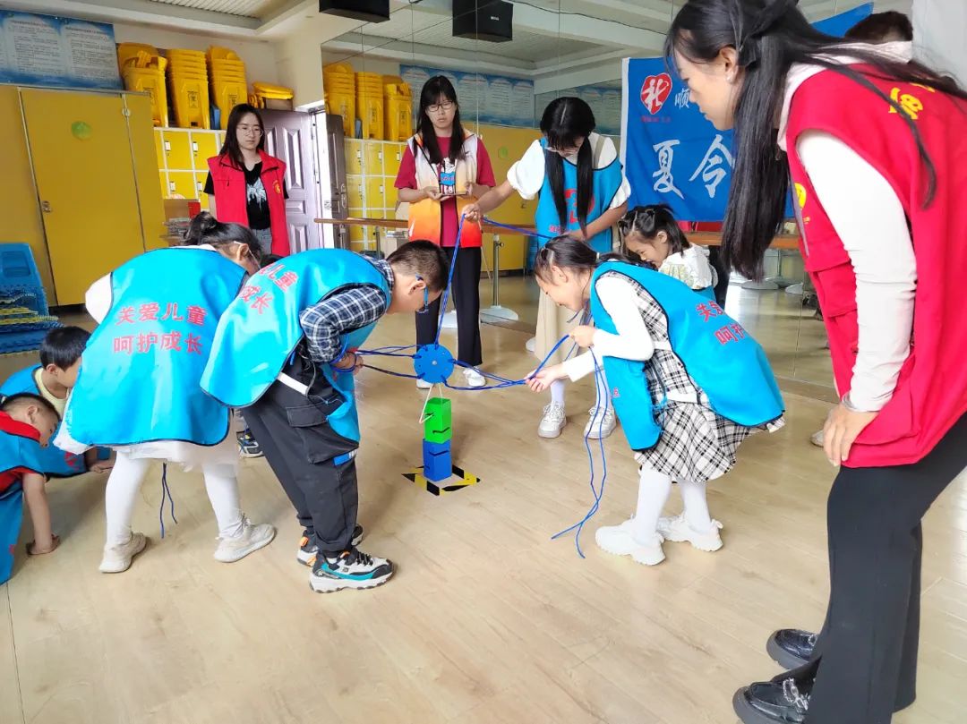 孩子们在大学生志愿者的带领下玩游戏,锻炼团队协作能力。(供图)