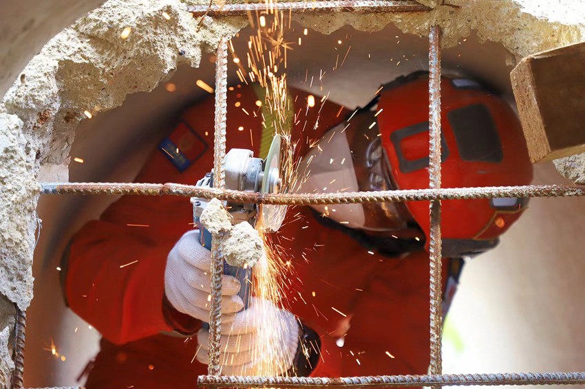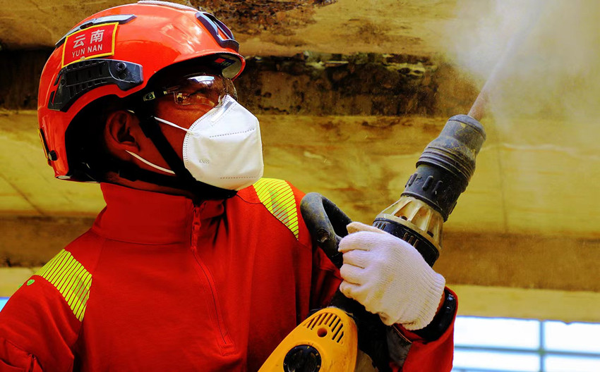 地震救援训练场上,模拟地震房屋倒塌、人员被困,森林消防员严密配合,生命搜索完成后进行顶撑破拆,而后进行伤员抢救和转运。