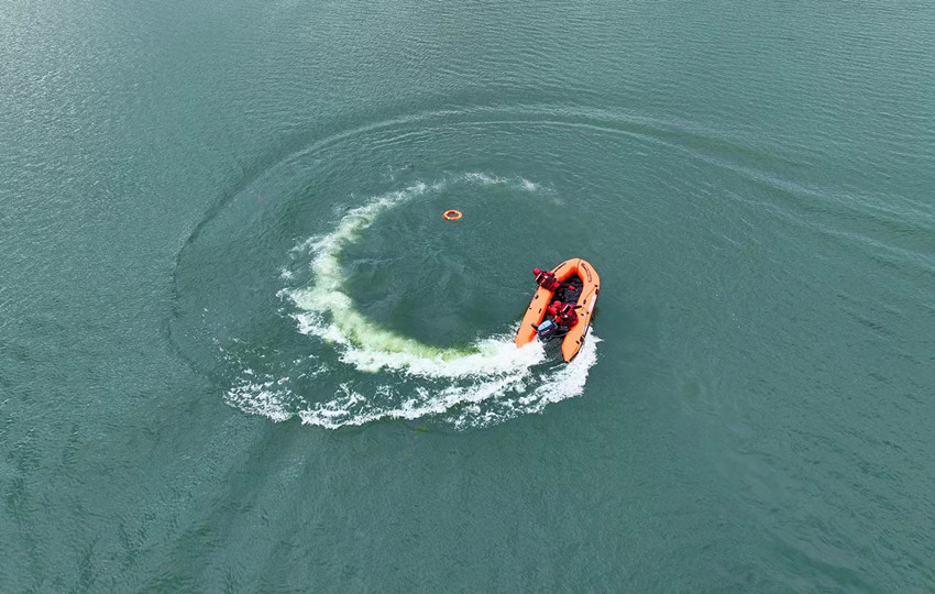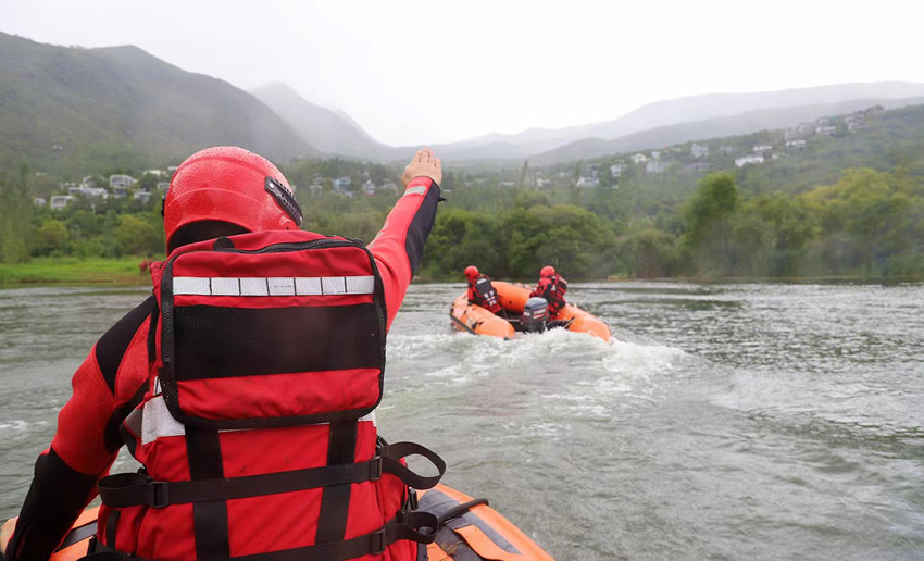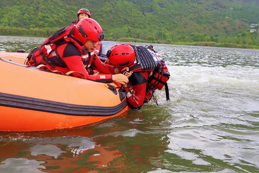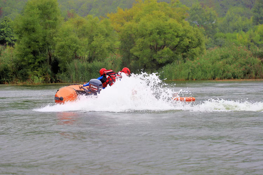 激流中,森林消防员驾驶橡皮艇破浪前行,精密完成高难度动作,争分夺秒抢救落水人员。
