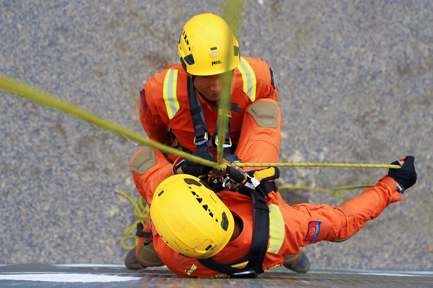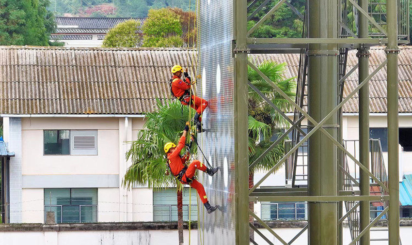 索降塔上,森林消防员飞檐走壁,情况模拟一名伤员被困绳上,森林消防员需直面双重重力、被困者情绪心态等因素影响,进行一对一高空绳索救援。