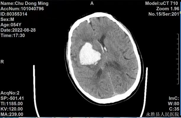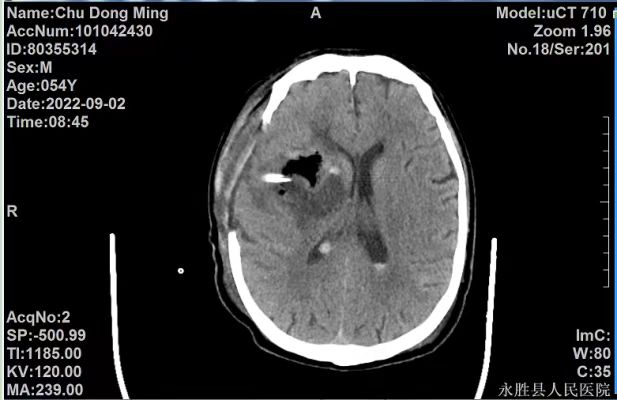 病例一:患者,男性,54岁,因“突发言语不清,意识模糊伴左侧肢体活动障碍5小时余”入院。入院后CT检查示:右侧基底节区急性大量脑出血,出血破入脑室系统,右侧侧脑室受压、中线结构向左移位。入院后诊断为:1.右侧基底节脑出血并破入脑室;2.脑疝形成;3.高血压3级,很高危组。患者病情危重,随时可能出现呼吸心跳骤停死亡,葛主任得知情况后迅速赶到医院,指导科室立即为患者实施开颅血肿清除术,手术顺利。目前患者正在做康复治疗。