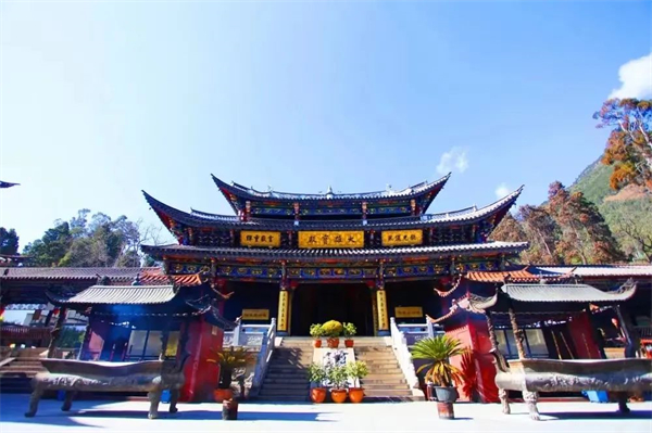 金顶寺坐落在海拔3248米的天柱峰顶。主要建筑有:三官殿、睹光台、钟楼、鼓楼、金殿、楞严塔、饮光殿、大雄宝殿等。金顶寺山门由白族艺人精心设计施工,风格独特,色彩艳丽,充分体现白族民间建筑艺术风格。