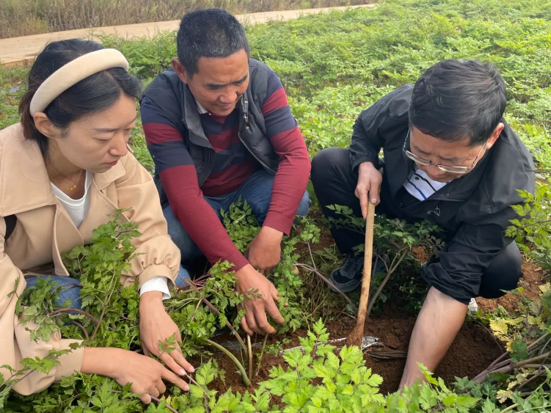 彭识(右一)在云当归种植基地察看云当归根茎生长情况。(丽江融媒记者 王璠 摄)