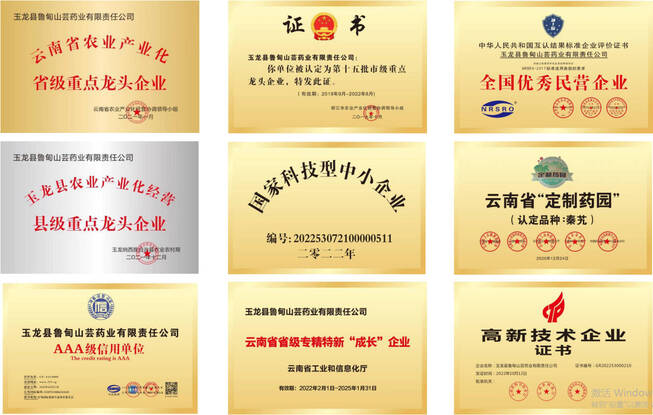 如今基地产品已进入国家中药材流通追溯体系,云南基地获得云南省定制药园、有机产品认证基地、丽江市绿色食品牌基地、国家权威检测质量合格产品、中国绿色环保产品、丽江市五大名品,通过ISO9001质量体系认证、IS014001环境管理体系认证、S045001职业健康安全管理体系认证,“山芸药业”品牌获得中国中药材行业驰名品牌、中国知名品牌、云南省著名品牌。荣获高新技术企业、全国优秀民营企业、AAA级信用单位、国家科技型中小企业 、云南省科技型中小企业、云南省重点龙头企业、云南省专精特新创新企业、云南省专精特新中小企业、丽江市5佳创新企业等。
