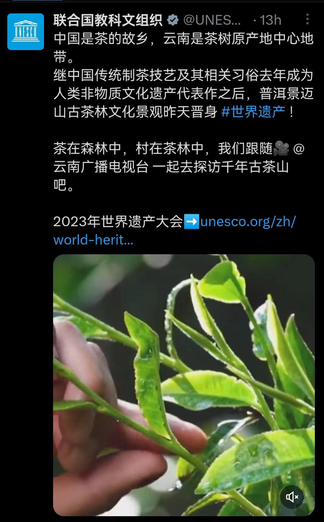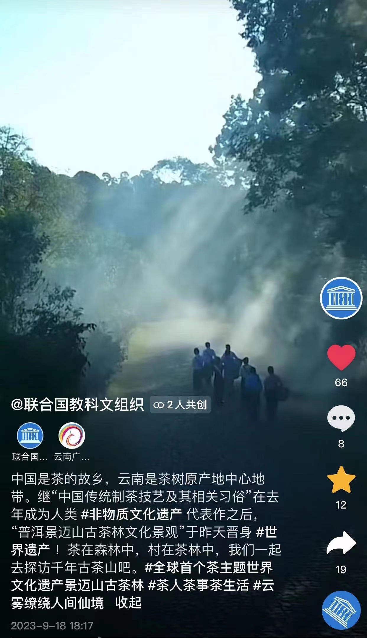 在景迈山申遗成功后,联合国教科文组织发表了一系列消息祝贺,而9月18日发布的“中国是茶的故乡,云南是茶树原产地中心地带”消息就是其中重要一条,随该消息发布的还有联合国教科文组织和云南广播电视台共创的世界遗产景迈山视频作品。回忆共创过程,云南广播电视台官方微博号主编赵小强表示:“9月17日晚,我正在紧张制作申遗相关作品,联合国教科文组织通过私信@云南广播电视台官方微博,邀请我们参与申遗视频共创,制作景迈山茶文化相关短视频。联合国教科文组织是《世界遗产名录》的官方发布机构,接到任务我非常激动,立即汇报领导并第一时间集结团队,整理景迈山相关素材资源,以最快速度提供视频短片。短片虽然时间不长,但我们精心选择了景迈山从全景、中景到特写的空间相关镜头,日出、晨雾、云海等时间相关镜头,以及当地群众采茶、制茶、泡茶、喝茶的生活相关素材,可以说,这条短视频较好地反应了景迈山‘茶在森林中,村在茶林中’风貌以及当地群众的幸福生活。”