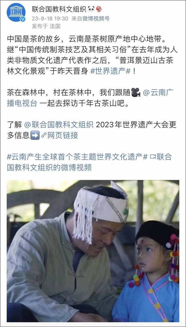 北京时间2023年9月18日下午,联合国教科文组织发布消息称“中国是茶的故乡,云南是茶树原产地中心地带”,展现了云南茶的世界影响力。