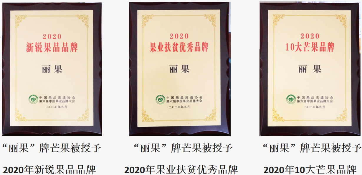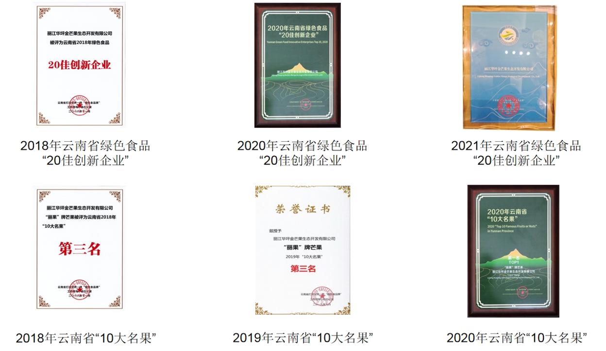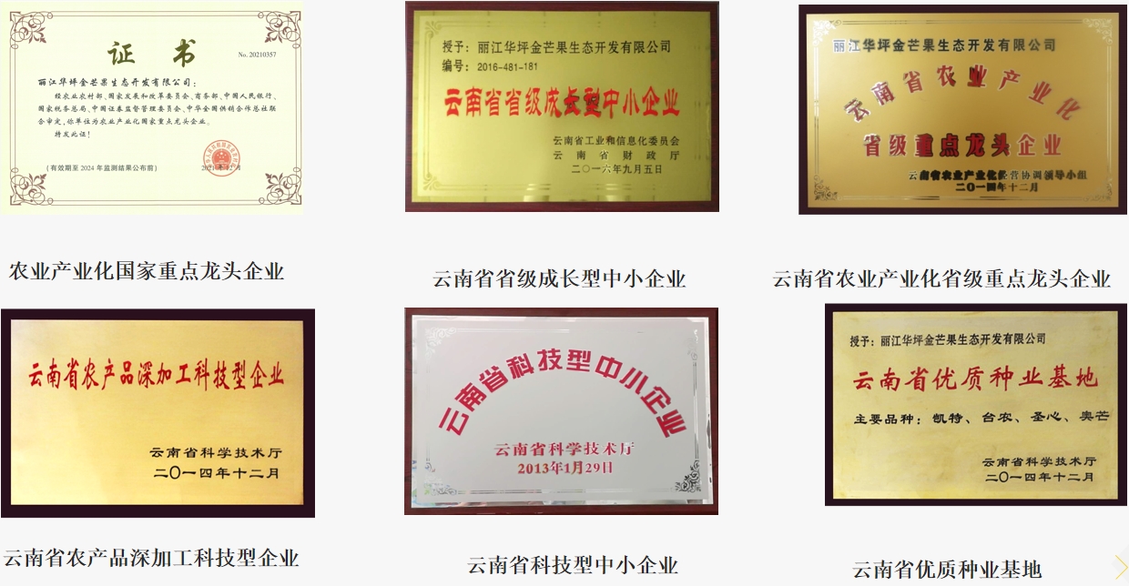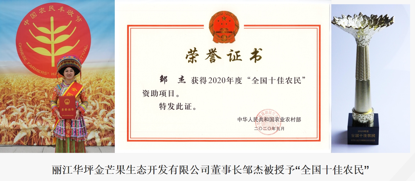 目前,金芒果公司主导参与的丽江芒果分级标准正式出台,以芒果产业为主导的丽江市安全农业标准产业化发展中心开始运营,与广东千里山合作的数字化分选中心已启动运营。在邹杰的带领下,先后荣获“国家级农业产业化龙头企业”、“省级农业产业化龙头企业”、“云南省科技型中小企业”、“云南省农产品深加工科技型企业”、“云南省优质种业基地”、“云南省省级成长型中小企业”。先后三次荣获云南省绿色食品“20佳创新企业”,连续四年荣获云南省“10大名果”,其中2020年荣获云南省“10大名果”第一名。公司“丽果牌”芒果被授予2020果业扶贫优秀品牌、新锐果品品牌、10大芒果品牌等荣誉称号,成功入选2020年中国农业品牌目录,董事长邹杰被授予“全国十佳农民”。