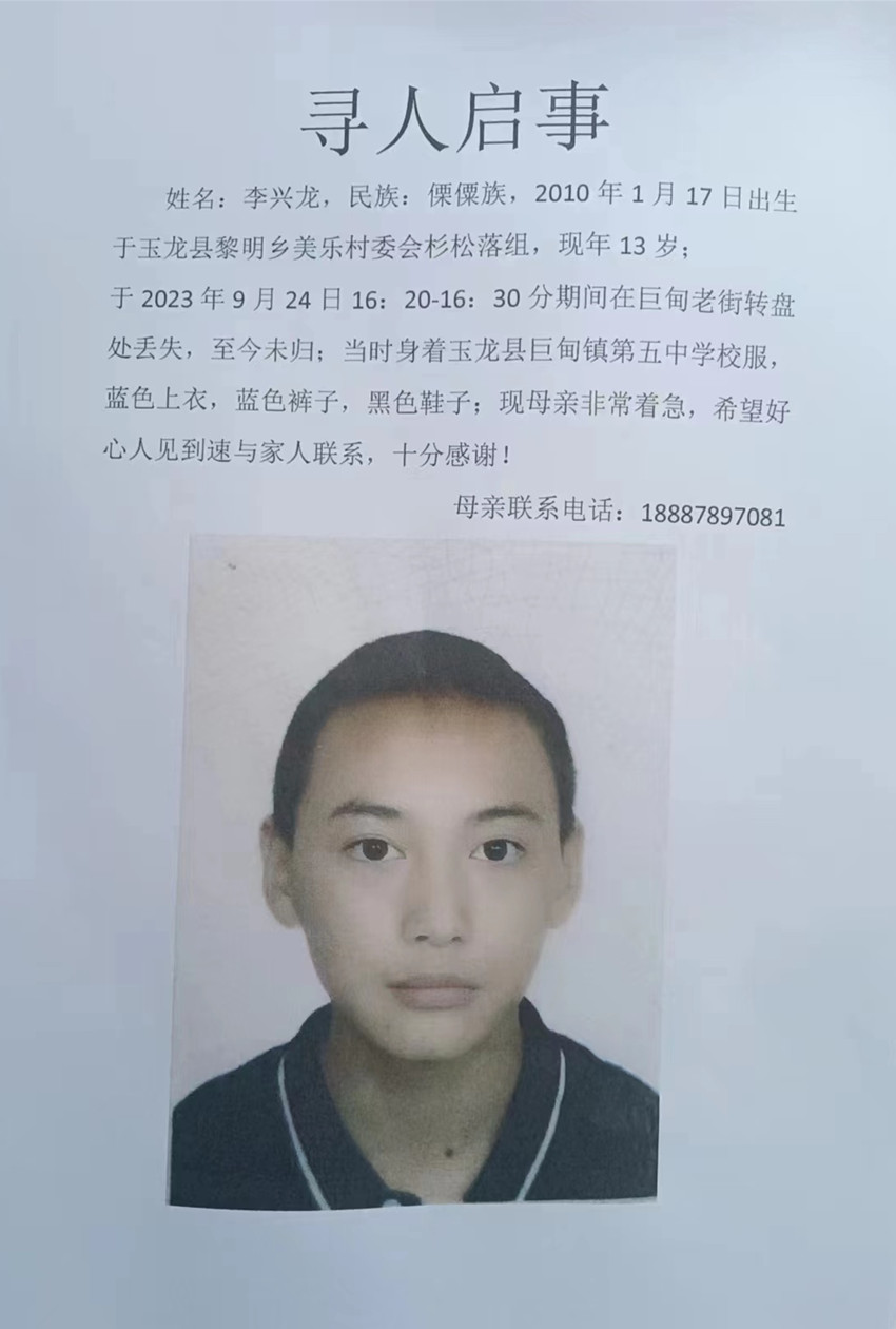 9月24日16:30,李兴龙于玉龙县巨甸老街转盘处走失,至今未归!李兴龙的家人十分着急!望有线索者能及时与他的家人取得联系!李兴龙母亲联系电话:18887897081