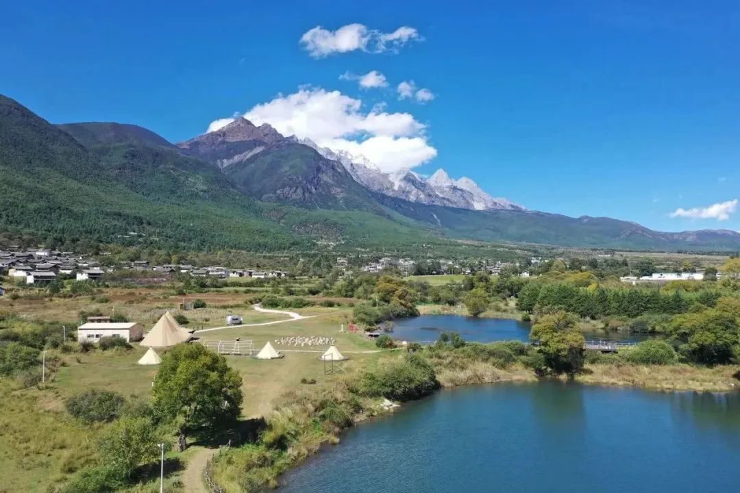 草甸、溪流、湖水、森林、栈道……自然组合而成的丽江地中海国际度假区营地,以绚丽的秋色和圣洁的玉龙雪山为背景,显得格外静美怡然。