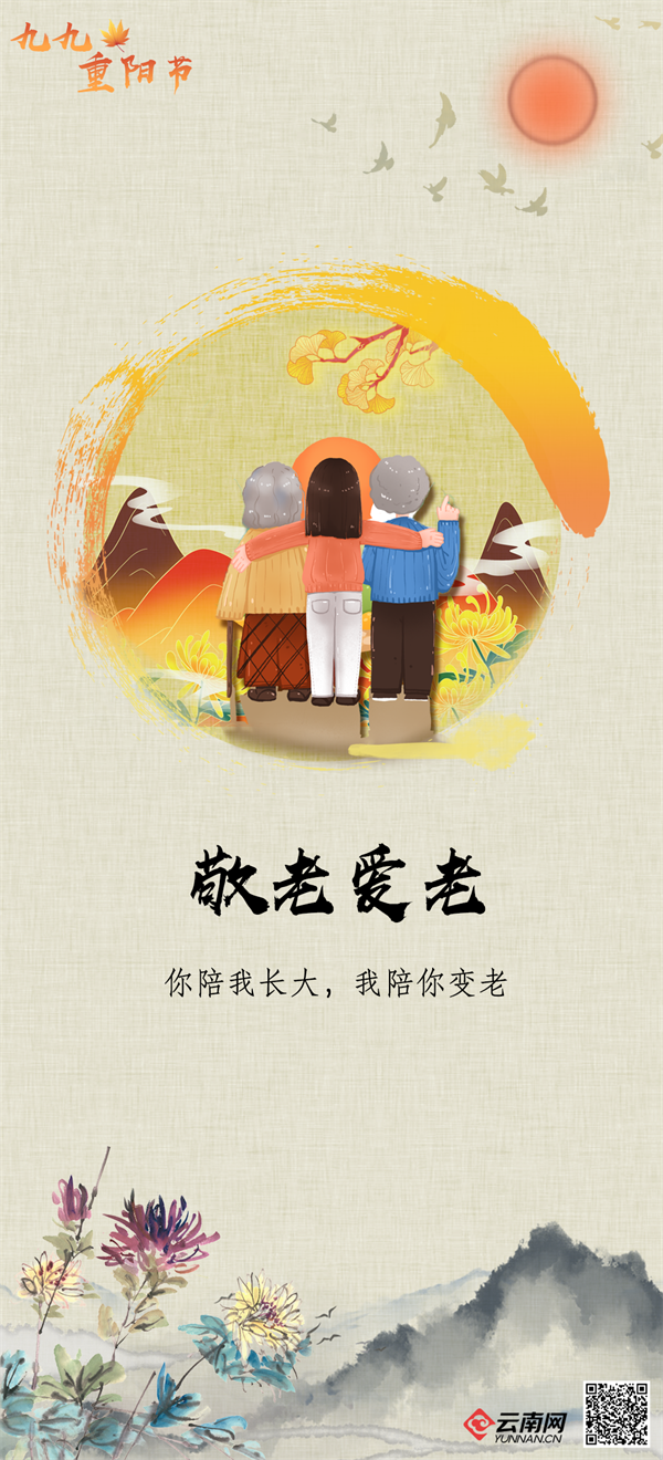 重阳,与“久久”同音,九在数字中又是最大数,有长久长寿的含意,秋季也是一年收获的黄金季节,重阳佳节,寓意深远,因此人们对此节历来有着特殊的感情,唐诗宋词中有不少贺重阳,咏菊花的诗词佳作。今天的重阳节,被赋予了新的含义。在1989年,我国把每年的九月九日定为老人节,传统与现代巧妙地结合,成为尊老、敬老、爱老、助老的老年人的节日。