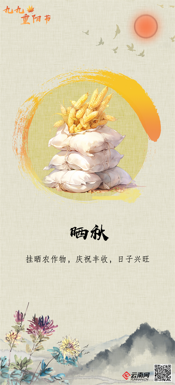 在古代,民间在重阳有登高的风俗,故重阳节又叫“登高节”。相传此风俗始于东汉。唐代文人所写的登高诗很多,大多是写重阳节的习俗;杜甫的七律《登高》,就是写重阳登高的名篇。登高所到之处,没有划一的规定,一般是登高山、登高塔。 据史料记载,重阳糕又称花糕、菊糕、五色糕,制无定法,较为随意。九月九日天明时,以片糕搭儿女头额,口中念念有词,祝愿子女百事俱高,乃古人九月作糕的本意。 讲究的重阳糕要做成九层,像座宝塔,上面还做成两只小羊,以符合重阳(羊)之义。 重阳节正是一年的金秋时节,菊花盛开,据传赏菊及饮菊花酒,起源于晋朝大诗人陶渊明。陶渊明以隐居出名,以诗出名,以酒出名,也以爱菊出名;后人效之,遂有重阳赏菊之俗。旧时文人士大夫,还将赏菊与宴饮结合,以求和陶渊明更接近。北宋京师开封,重阳赏菊之风盛行,当时的菊花就有很多品种,千姿百态。 民间还把农历九月称为“菊月”,在菊花傲霜怒放的重阳节里,观赏菊花成了节日的一项重要内容。清代以后,赏菊之习尤为昌盛,且不限于九月九日,但仍然是重阳节前后最为繁盛。 重阳节插茱萸的风俗,在唐代就已经很普遍。古人认为在重阳节这一天插茱萸可以避难消灾;或佩带于臂,或作香袋把茱萸放在里面佩带,还有插在头上的。大多是妇女、儿童佩带,有些地方,男子也佩带。 重阳节佩茱萸,在晋代葛洪《西经杂记》中就有记载。除了佩带茱萸,人们也有头戴菊花的。唐代就已经如此,历代盛行。清代,北京重阳节的习俗是把菊花枝叶贴在门窗上,“解除凶秽,以招吉祥”。这是头上簪菊的变俗。宋代,还有将彩缯剪成茱萸、菊花来相赠佩带的。 “重阳晒五样,日子会变旺”重阳节是最好的赏秋时期,中国南方部分地区依然保留了“晒秋”的特色。“晒秋”是一种典型的农俗现象,在山区,由于地势复杂,村庄平地极少,人们便利用房前屋后及自家窗台屋顶架晒、挂晒农作物。 而重阳晒五样的五样,分别指的是辣椒、黄菊、柿子、玉米、茱萸,看着这些秋收的果实,日子也像他们一样,红红火火,越来越旺。 在重阳节中,人们要表达对老人的孝敬,倡导全社会树立尊老、敬老、爱老、助老的风气。 2006年5月20日,重阳节被国务院列入首批国家级非物质文化遗产名录。2013年正式实施的新《老年人权益保障法》明确规定,每年农历九月初九为老年节。