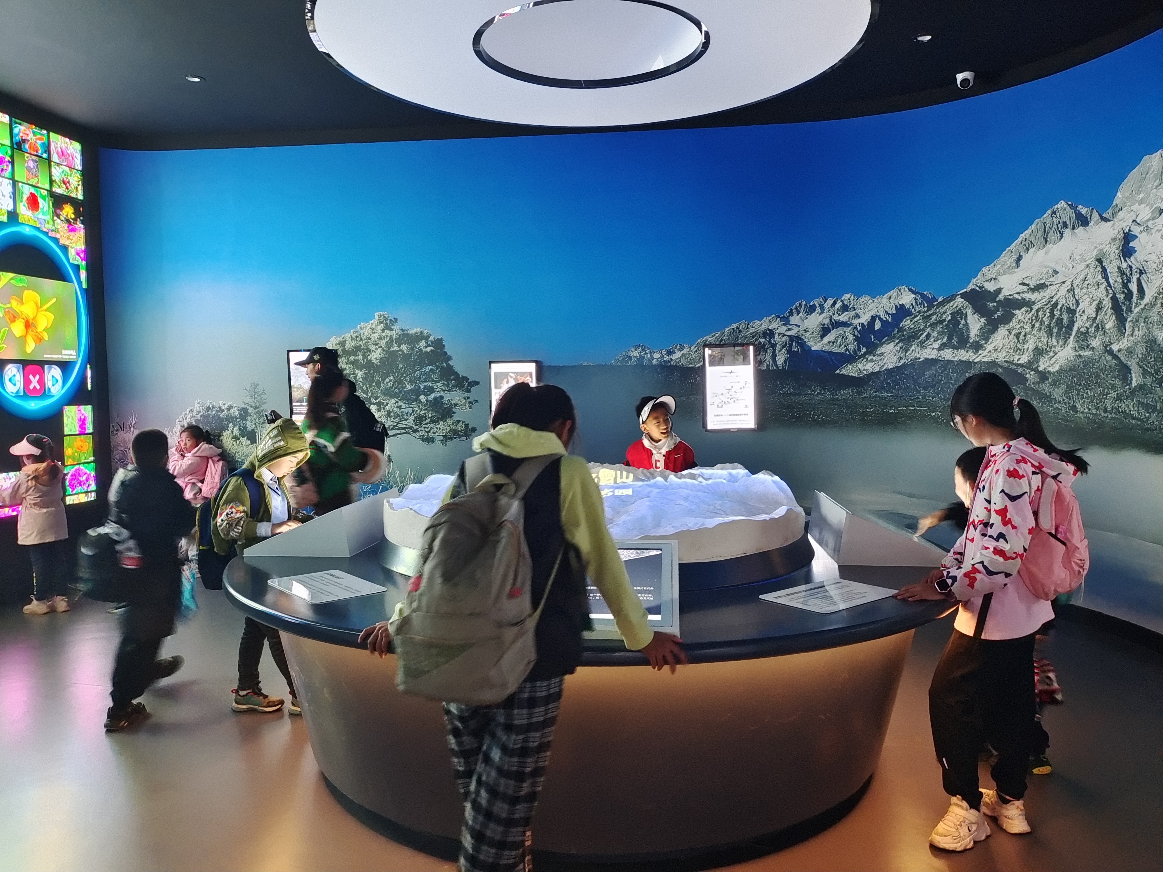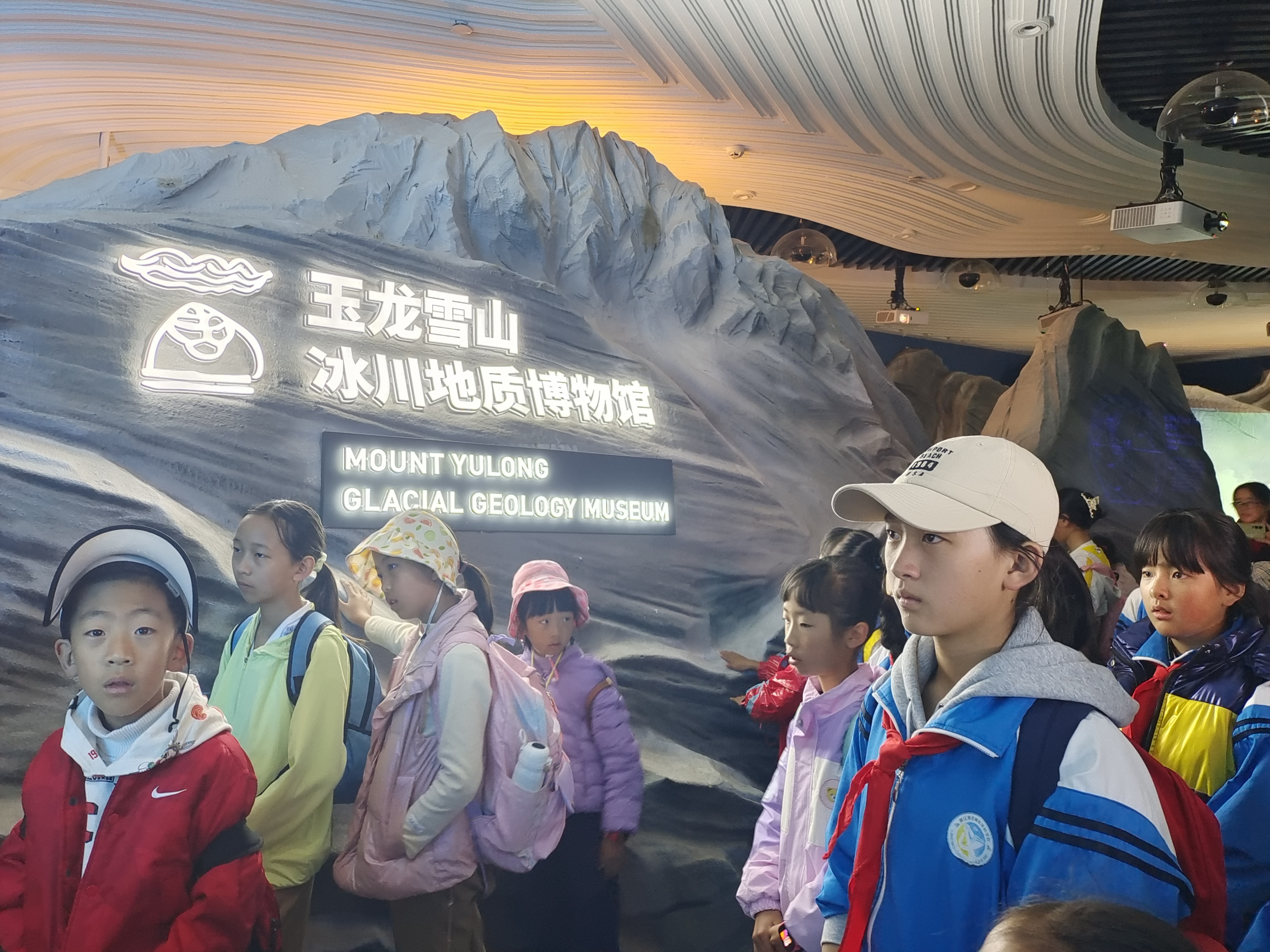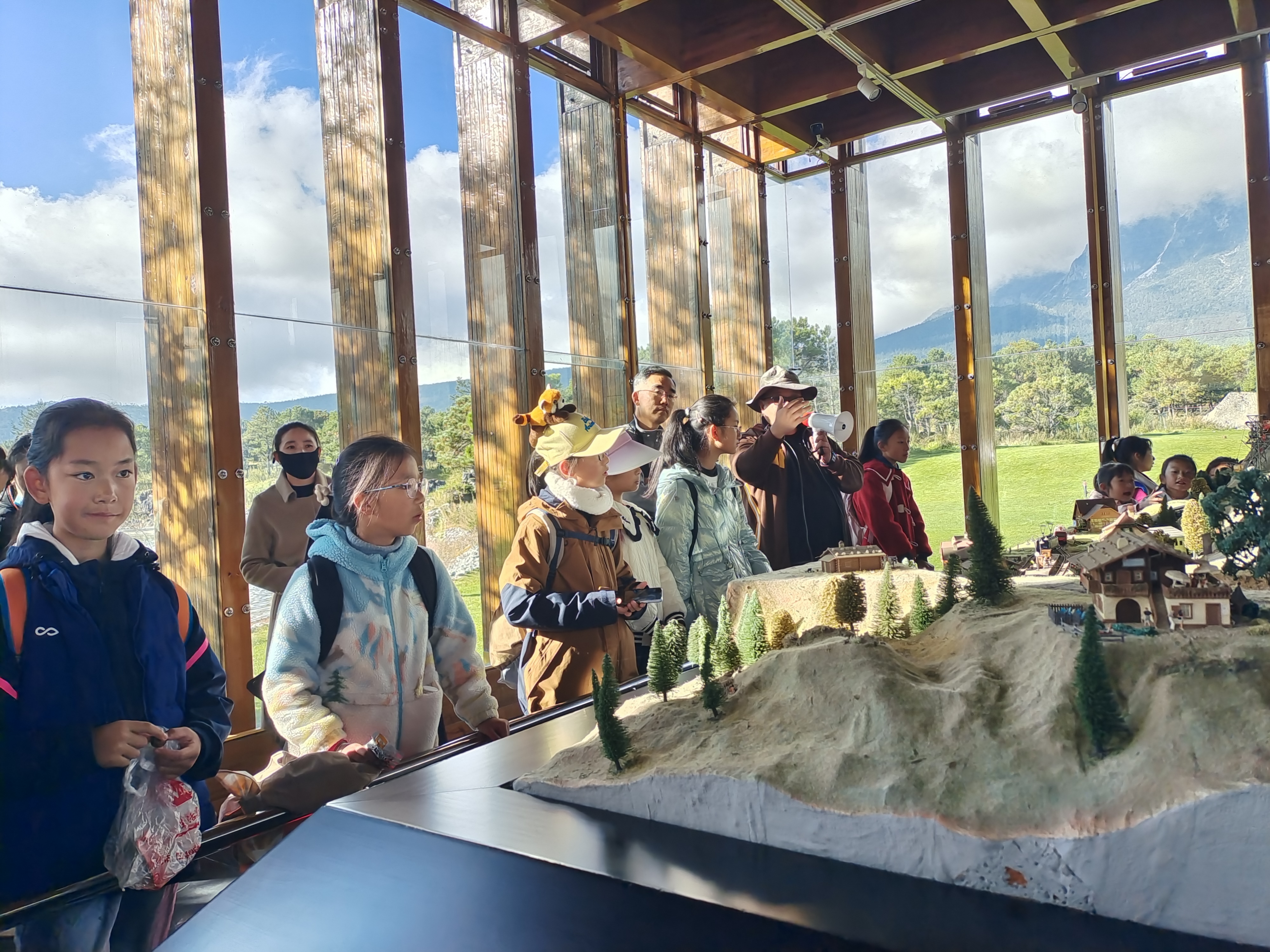 活动中,同学们还一同前往了玉龙雪山生态旅游区省级科普教育基地——玉龙雪山冰川博物馆。奇幻的场景交互,AR的互动体验,身临其境的人工造雪场景游玩,整个场馆利用科技和数字化手段展示了玉龙雪山数亿年来的地质演变过程以及奇幻的自然景观、渊远流长的历史文化。通过研学活动,孩子们的见识更广了,知识得到提升。也进一步认识到自己的家乡,看到更美丽的丽江,树立孩子们爱护环境,保护环境意识。