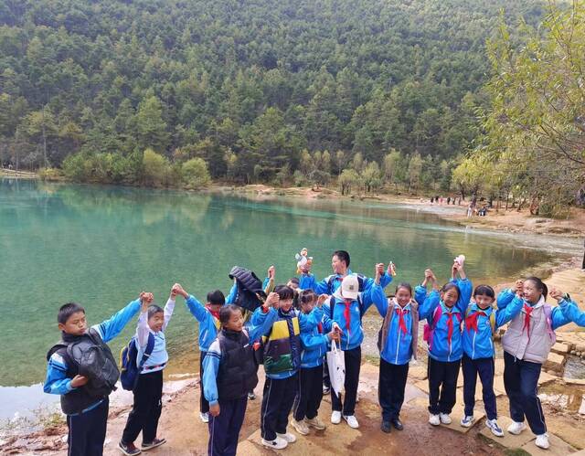 在玉龙雪山蓝月谷景区,来自一区四县的一百余名青少年儿童站在《一滴水经过丽江》纪念石碑旁深情朗诵,共同表达对美好宁静、依存于自然的生活的赞美和向往。朗诵结束后,孩子们还一同游览了甘海子、冰川博物馆等景点。