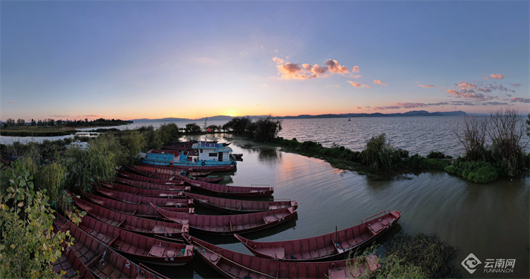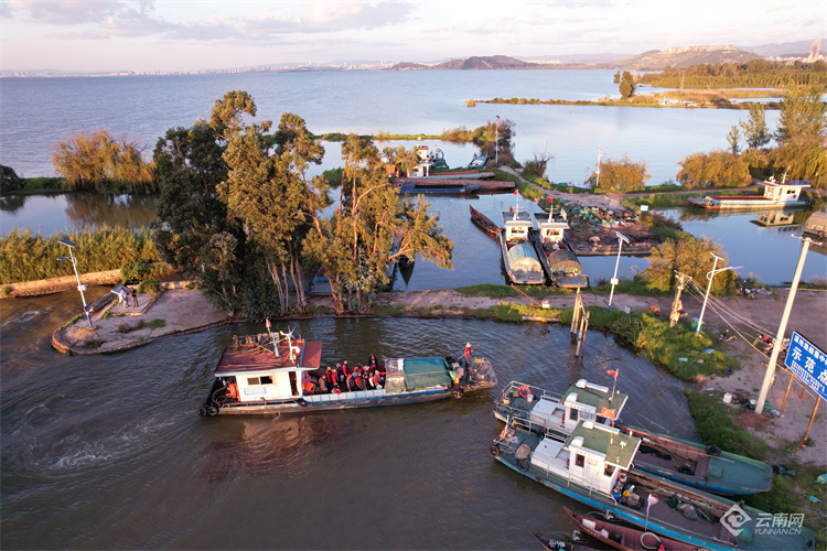 深秋的昆明温暖如春,海埂公园游人如织,海鸥飞舞的滇池点缀着几十只大大小小的船只与湖面相映成趣。船还是曾经的渔船,如今,只是在滇池上打捞枯死的水生植物及水面漂浮物等垃圾。在滇池边长大的徐春是船队中的一员,他的工作日常就是划着小渔船配合同事在滇池沿岸打捞垃圾做好湖面保洁工作。徐春和船上两位队员是同事也是同村,他们都是滇池南岸的晋宁区晋城街道沙堤村委会兴隆村人。
