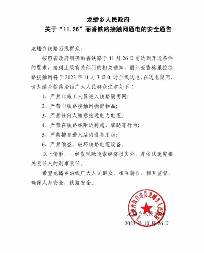 《关于“11.26”丽香铁路接触网通电的安全通告》