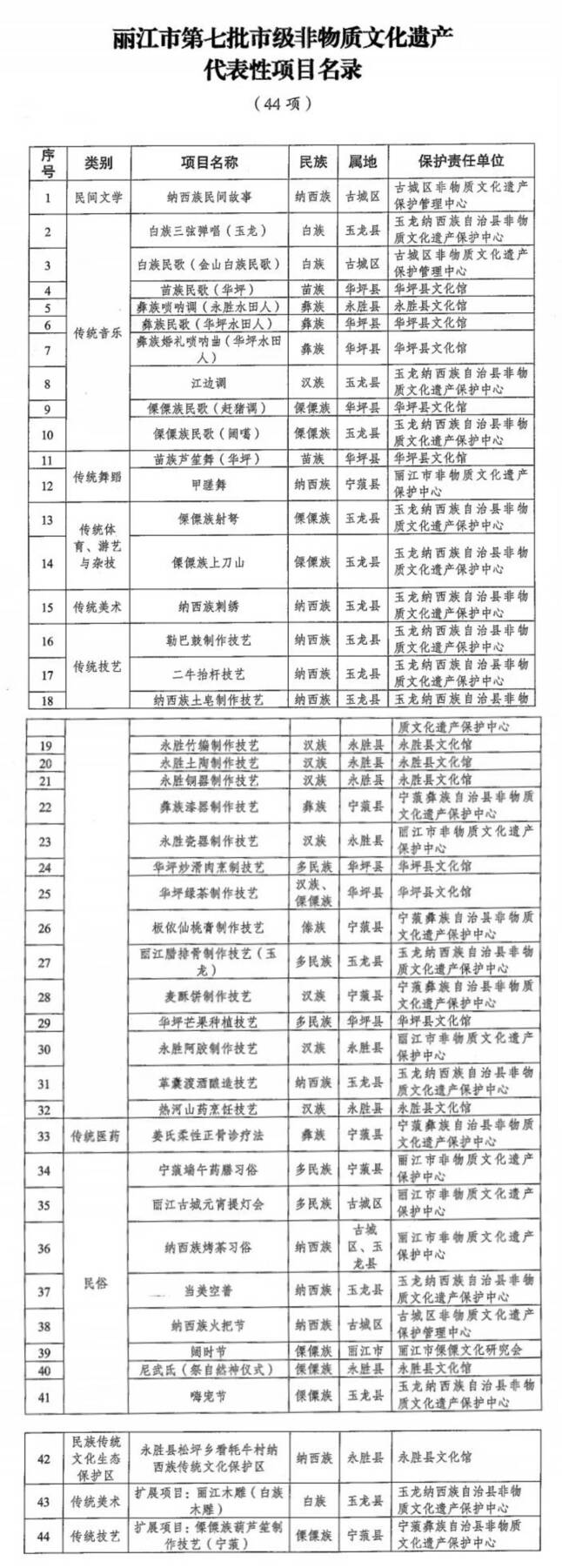 市人民政府批准市文化和旅游局确定的丽江市第七批市级非物质文化遗产代表性项目名录(44项),现予公布。