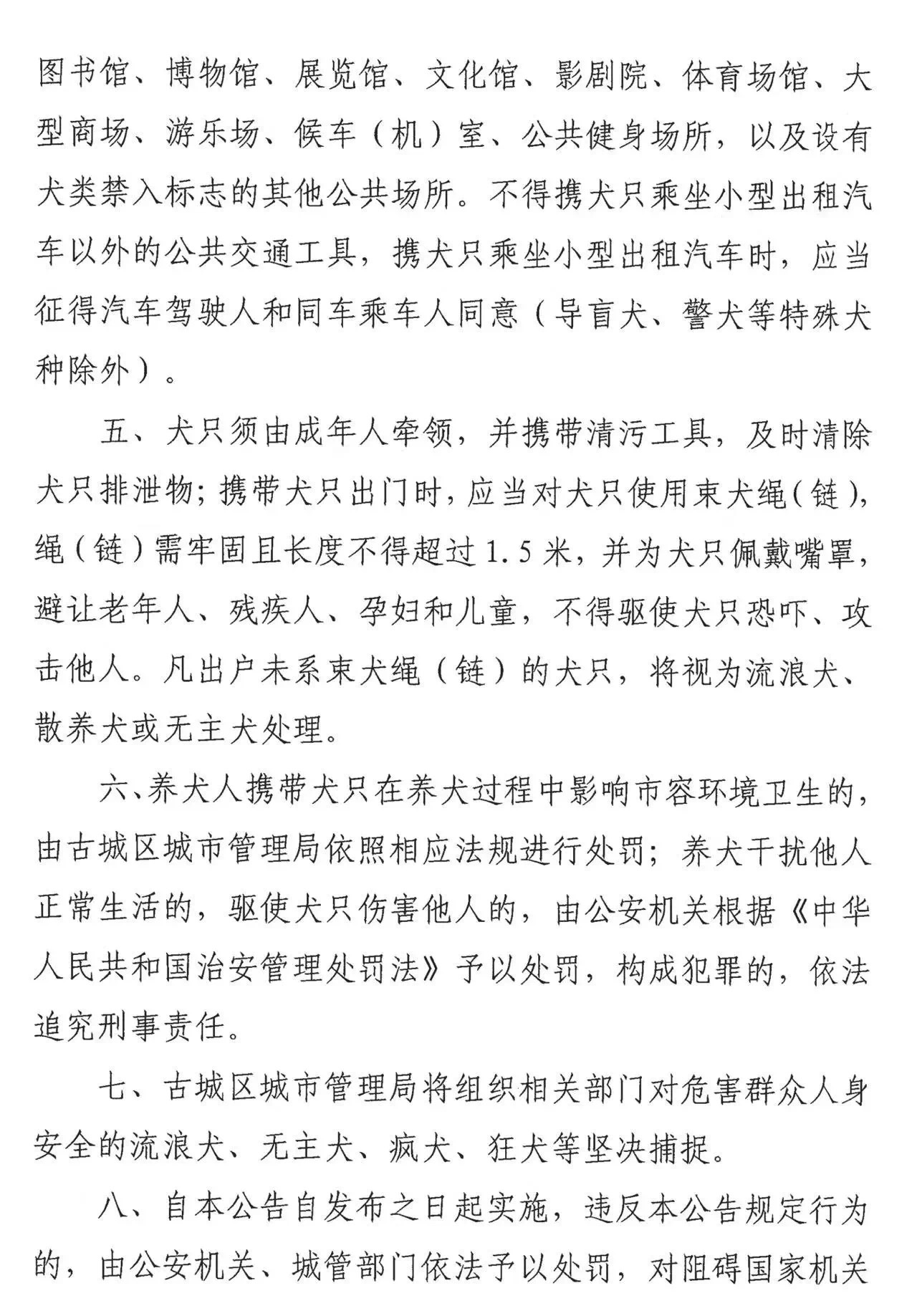 七、古城区城市管理局将组织相关部门对危害群众人身安全的流浪犬、无主犬、疯犬、狂犬等坚决捕捉。