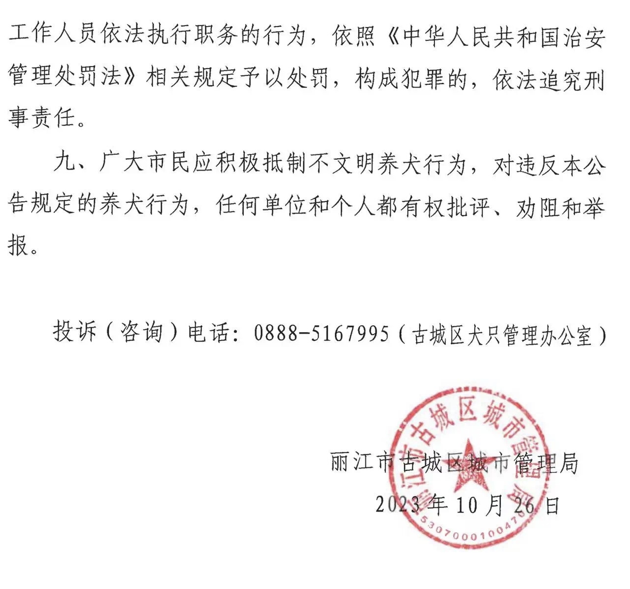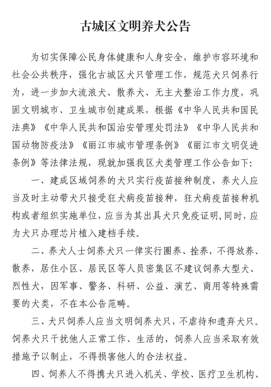 为切实保障公民身体健康和人身安全,维护市容环境和社会公共秩序,强化古城区犬只管理工作,规范犬只饲养行为,进一步加大流浪犬、散养犬、无主犬整治工作力度,巩固文明城市、卫生城市创建成果,根据《中华人民共和国民法典《中华人民共和国治安管理处罚法》《中华人民共和国动物防疫法》《丽江市城市管理条例》《丽江市文明促进条例》等法律法规,现就加强我区犬类管理工作公告如下: