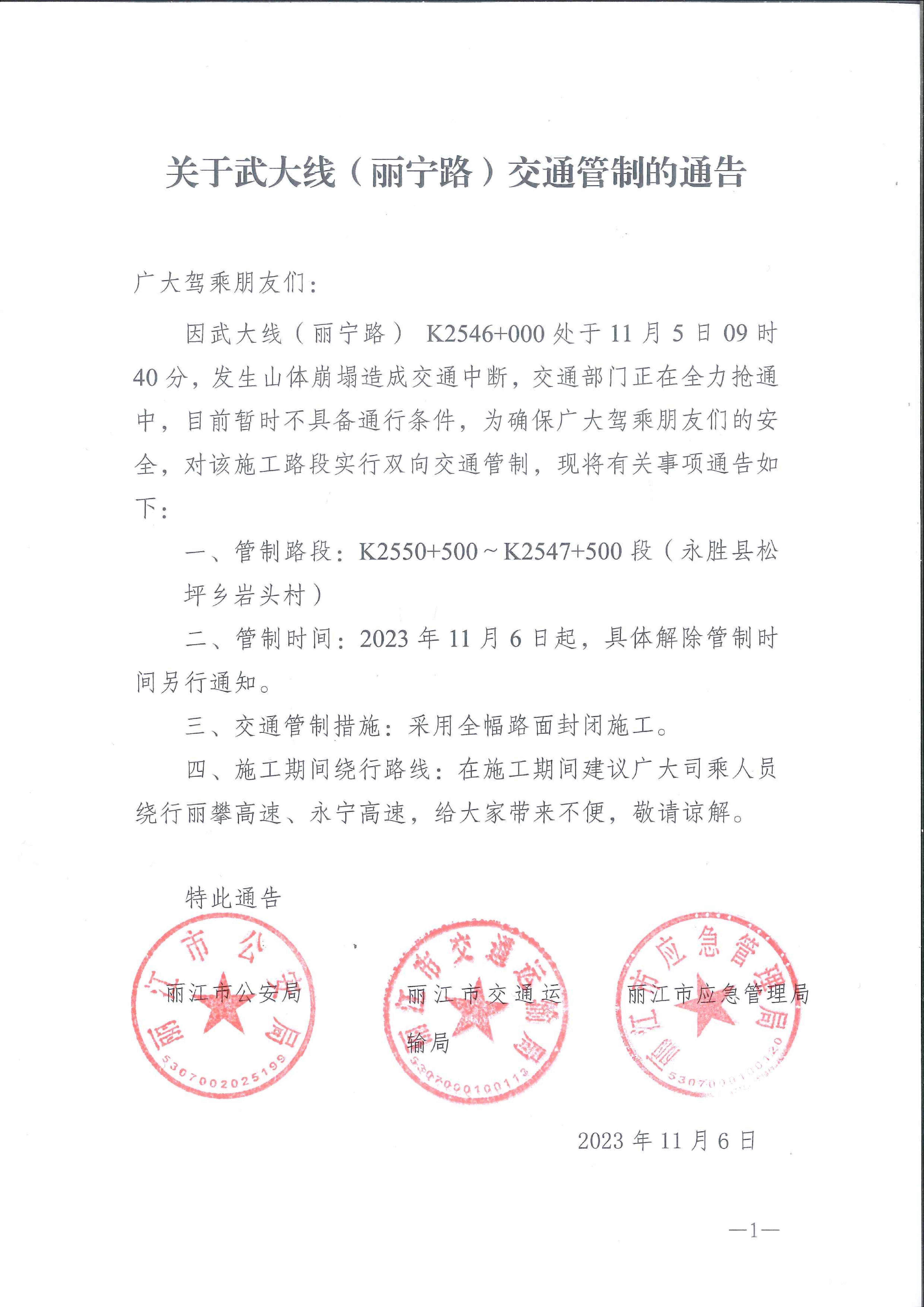 因武大线(丽宁路)K2546+000处于11月5日09 时40 分,发生山体崩塌造成交通中断,交通部门正在全力抢通中,目前暂时不具备通行条件,为确保广大驾乘朋友们的安全,对该施工路段实行双向交通管制,现将有关事项通告如下: