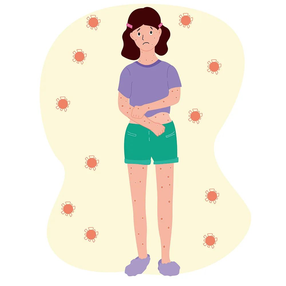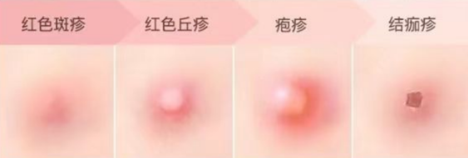 临床表现为身体皮肤黏膜上分批出现斑丘疹、疱疹,最后形成结痂。