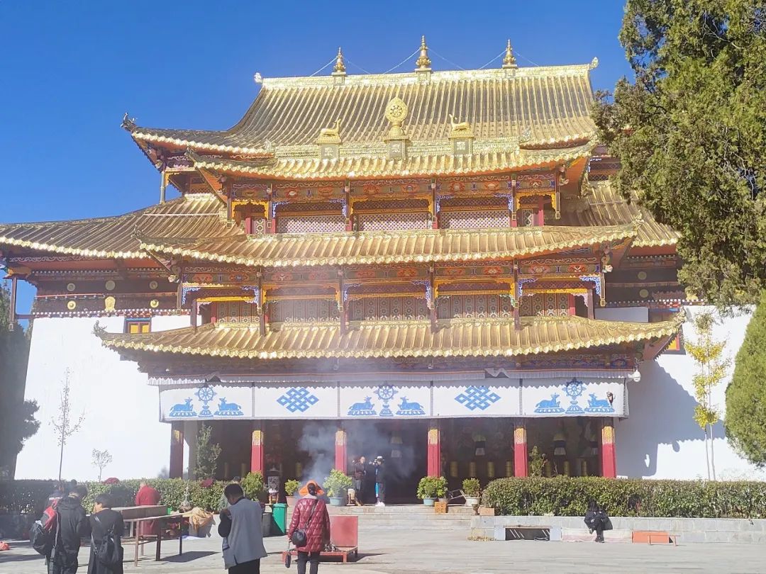 云南省重点文物保护单位扎美喇嘛寺位于永宁镇古尔山脚下,规模宏大、金碧辉煌,建筑风格融汉、藏为一体,与格姆山(狮子山)迎面相对,是滇川交界摩梭人、普米族区域最大的藏传佛教格鲁派(黄教)寺院,在信众中有较大影响力。寺院简介碑中明确记载,它始建于清康熙年间,因地处扎美村而得名。鼎盛时期有僧侣近千人,正殿、偏殿、禅房内共有近万尊大小佛像。1969年,大部分建筑和造像被毁,1986年重修正殿。扎美寺的现存壁画用笔精细、着色艳丽,造型形式丰富多彩,实现了佛教艺术世俗性和宗教性的完美结合,在各方面都具有极高价值。本土文艺家徜徉在这座古寺名刹,心生敬畏,感受了特色浓郁的多元文化。