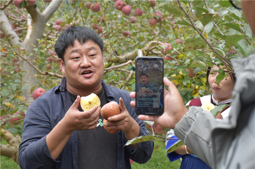 “你看这就是我们丽江红水塘村的糖心苹果,它又大又甜还多汁,特别好吃!想购买的家人们在公屏上扣‘想要’。”三农主播 “石榴哥”金国伟正在红水塘村的苹果园里做直播,“我们拍短视频做直播,让更多网友知道红水塘苹果很好吃,未来我们还要跟村里达成更多的合作。”