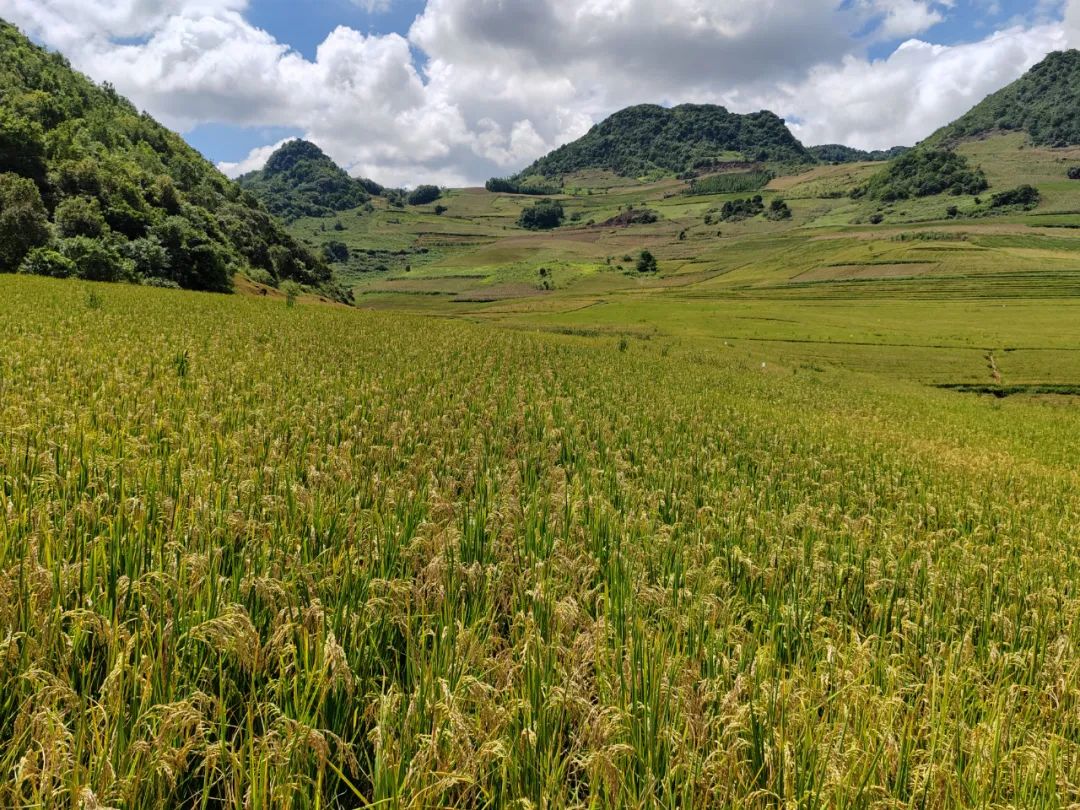 十月寒露,天气微凉,在西南边陲的云南省澜沧县竹塘乡蒿枝坝,这里却热气腾腾,几百亩连片的金黄稻浪沿着山坡起伏,稻穗在阳光下格外耀眼,蒿枝坝的村民们正在忙碌着,因为今年南方旱地水稻的丰收季已经来临。