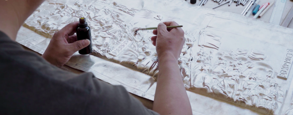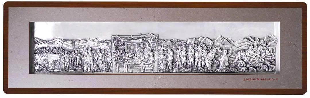 百岁坊《红色丽江 百年献礼》银版画,分别为《红军长征过丽江》、《学生运动》、《武装斗争》三幅组图。总共耗时三年时间,期间共启用3位工匠大师,6名助手,捶打、錾刻千万余次,每幅银版画用料5000余克,采用手工錾刻、立体浮雕技艺,经过仿古做旧处理,丽江东巴纸内衬加以黑檀木画框装裱,将丽江经典红色革命场景再现于银版画中。