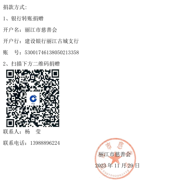 请各行政企事业单位、社会各界爱心人士将捐款人姓名、捐款金额、统一社会信用代码(行政企事业单位)、手机联系号码发送至丽江市慈善会电子邮箱(ljscishanhui@163.com)。收到捐款后丽江市慈善会将电子捐赠收据以短信的方式发送到预留电话上。