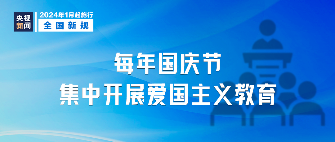 《中华人民共和国爱国主义教育法》自2024年1月1日起施行,其中规定在每年10月1日中华人民共和国国庆日,国家和社会各方面举行多种形式的庆祝活动,集中开展爱国主义教育等。