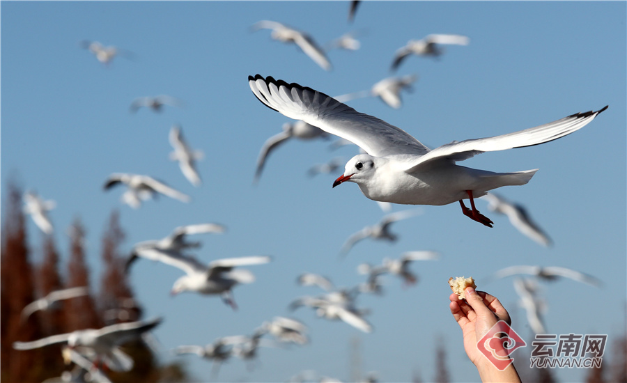 昆明海埂大坝,红嘴鸥在冬日暖阳中约会昆明蓝。杨峥 摄