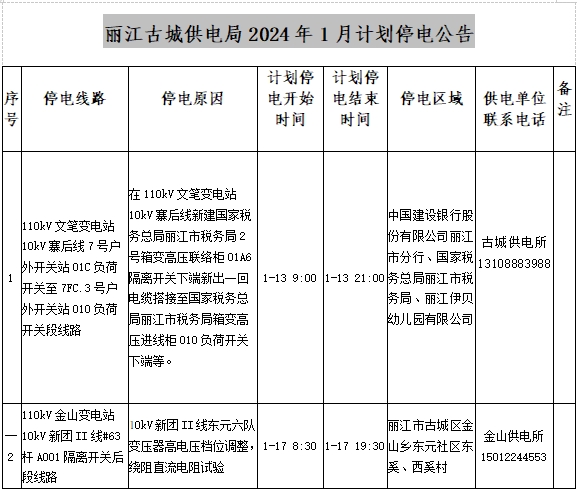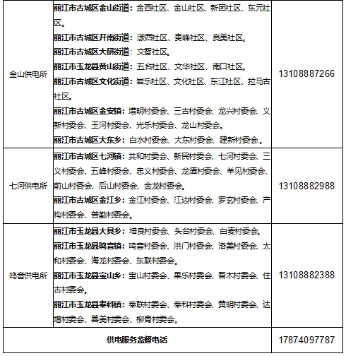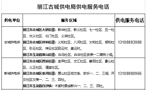 3、为保障您的用电问题能快速得到及时处理,在您有用电服务需求时请您拨打丽江古城供电局24小时供电服务热线,我们将竭诚为您服务!