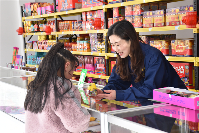烟花爆竹销售点销售人员向小朋友告知燃放烟花注意事项