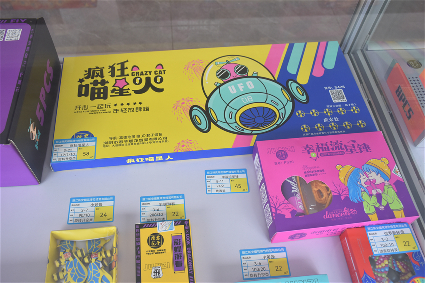 记者发现,近年来各品类的烟花爆竹越来越人性化,在其包装上都会印有二维码,消费者可以通过扫描二维码查看各类烟花燃放的效果,再按需购买。