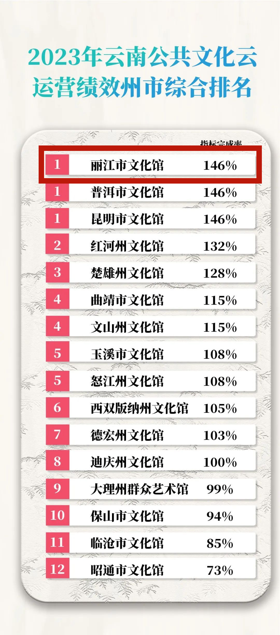近日,云南省文化和旅游厅发布《云南公共文化云数字化发展白皮书》,丽江市文化馆公共文化云平台在2023年云南公共文化云运营绩效州市综合排名第一!平台基础业务完成情况、发布志愿活动场次、稿件原创数量等均名列前茅。