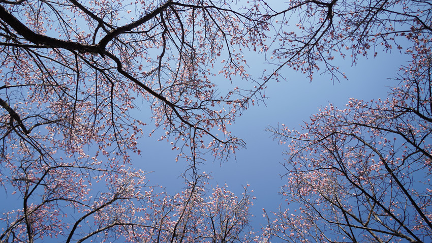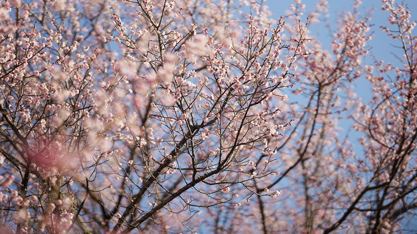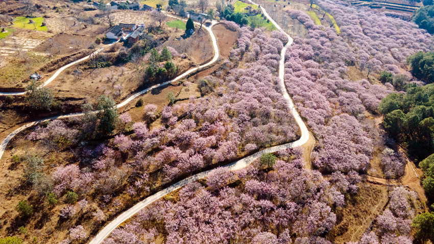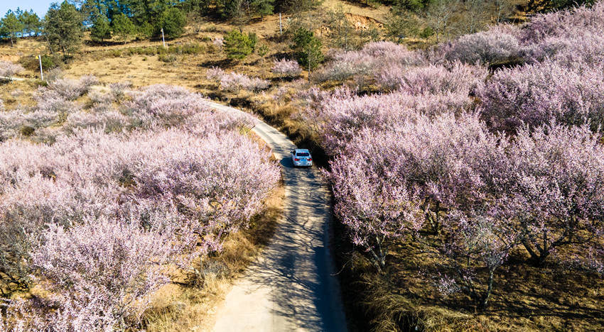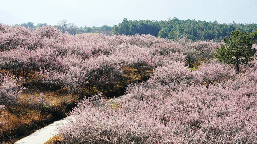 车沿河谷公路前行,越过一道又一道的山脊线与山谷,大约一小时后,那一片梅林就瞬间展现在眼前——在大安乡枯黄的地面上盛开出的一片壮阔的梅林。与远处挺拔的松林不同,开成海的淡粉无疑是这个时节这个村庄最亮丽的色彩。