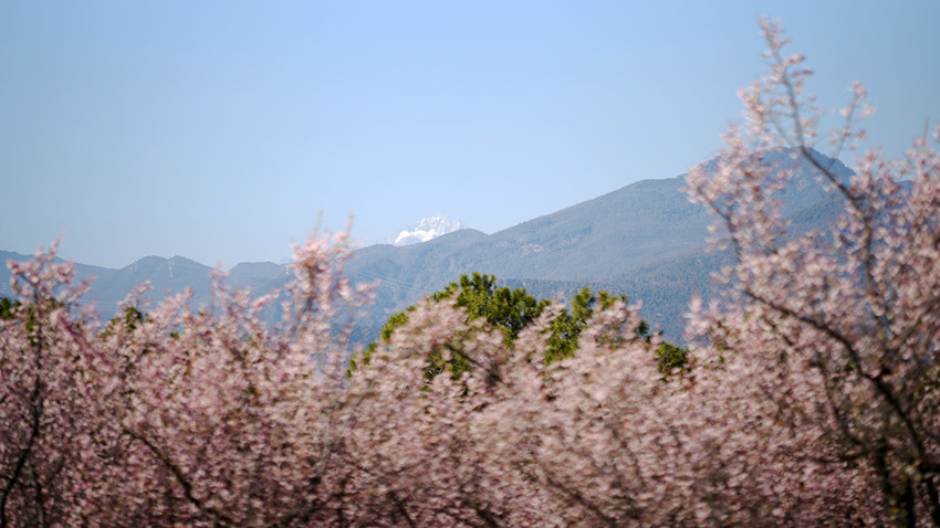 还未走进林间,山风已拂来暗香,引人禁不住脚步迈入梅林深处。梅花,早已融入我们日常生活和文化精神的角落,出现在田间、庭院,诗词、绘画、小说……而这冬天里盛开的花,似乎喜欢与雪对应,“有梅无雪不精神,有雪无诗俗了人”、“梅须逊雪三分白,雪却输梅一段香”……于是,不知是植梅人的有意还是赏梅人的不经意,在培元村的梅林,也望见了玉龙雪山,越过金沙江与层峦叠障,远山近梅间, “梅林映雪”也成了这里的景致。