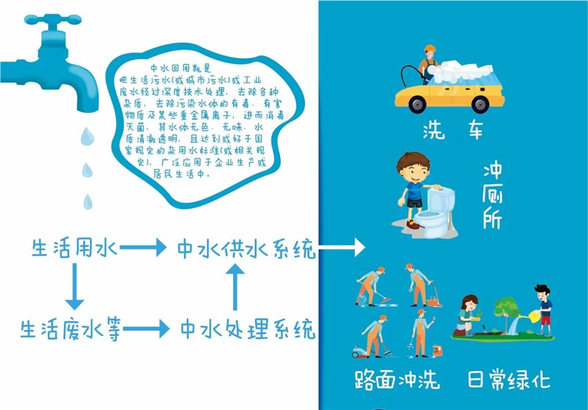 中水也叫再生水,是指污水经过处理后,达到一定的水质指标,满足某种使用要求,可进行有益使用的水。它可用于冲洗厕所、浇灌绿地、冷却设备补充、工业用水等众多领域。与海水淡化或跨流域调水相比,中水具有明显的优势。从经济的角度看,中水的成本最低,从环保的角度看,污水再生利用有助于改善生态环境,实现水生态的良性循环。