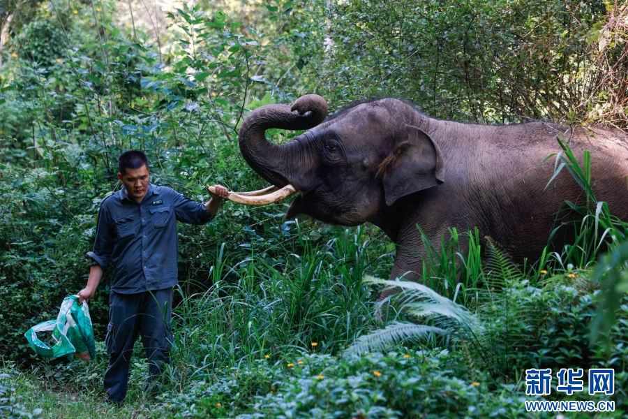 “象爸爸”邬绍能陪伴“小强”进行野化训练(2023年11月5日摄)。新华网 刘云 摄