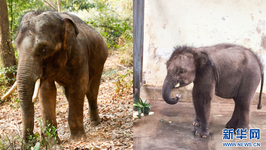 拼图:左图为如今茁壮成长的“小强”(2023年11月5日摄)。新华网 刘云 摄;右图为刚到中心不久幼年的“小强”(资料图)。新华网发(西双版纳野象谷 供图)