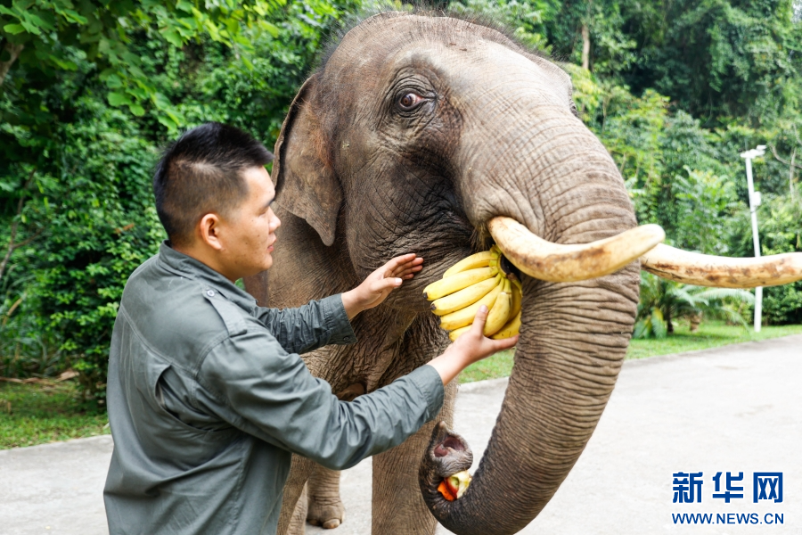 “象爸爸”邬绍能给“小强”喂食水果(2023年11月5日摄)。新华网 刘云 摄