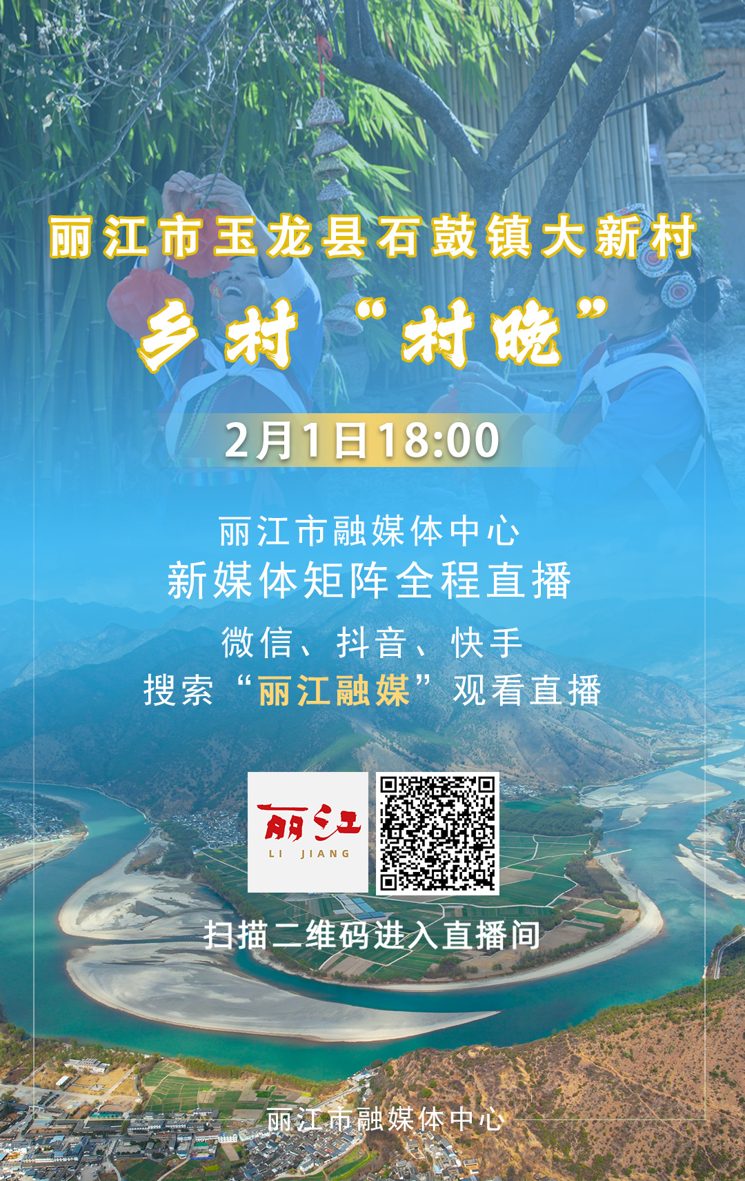 2024年2月1日18:00,玉龙县石鼓镇大新村举办乡村“村晚”。此次“村晚”紧扣国家党政方针以及村民日常生活,展示玉龙县新农村建设的新风貌。届时,丽江市融媒体中心将通过新媒体矩阵对晚会进行网络直播。大家可通过“丽江融媒”APP、微信、抖音、快手等平台观看直播。